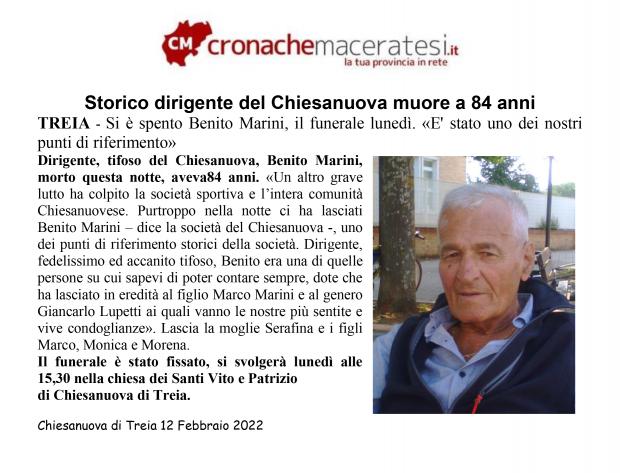 n altro grave lutto ha colpito la società sportiva e l'intera comunità Chiesanuovese. Purtroppo nella notte ci ha lasciati Benito Marini, uno dei punti di riferimento storici della società. Dirigente e fedelissimo ed accanito tifoso, Benito era una di quelle persone su cui sapevi di poter contare sempre, dote che ha lasciato in eredità al figlio Marco Marini e al genero Giancarlo Lupetti ai quali vanno le nostre più sentite e vive condoglianze. Abbracciamo la famiglia Marini e siamo vicini al loro dolore. "Non so dove vanno le persone quando muoiono ma so dove restano"
