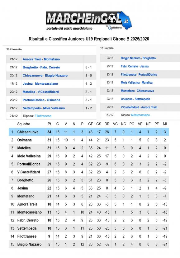 CU.226 JUNIORES Aggiornamento Risultati e Classifica ..
