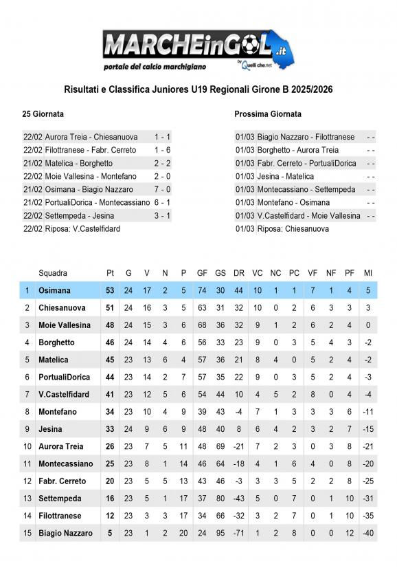 CU.226 JUNIORES Aggiornamento Risultati e Classifica ..