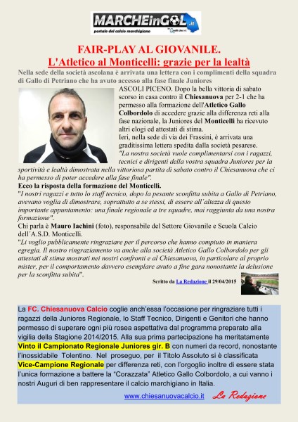 CU. 220 JUNIORES: Auguri all'Atletico Gallo Colbordolo