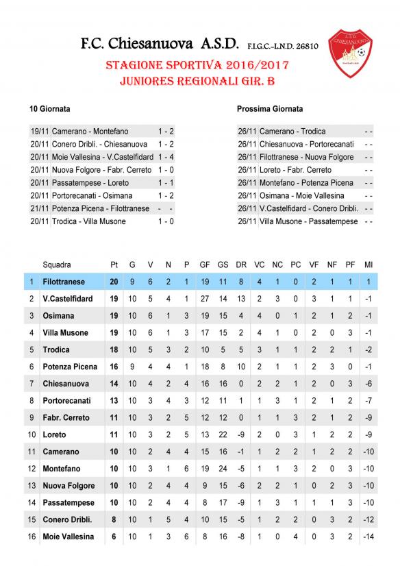 CU.226 JUNIORES Aggiornamento Risultati e Classifica ..