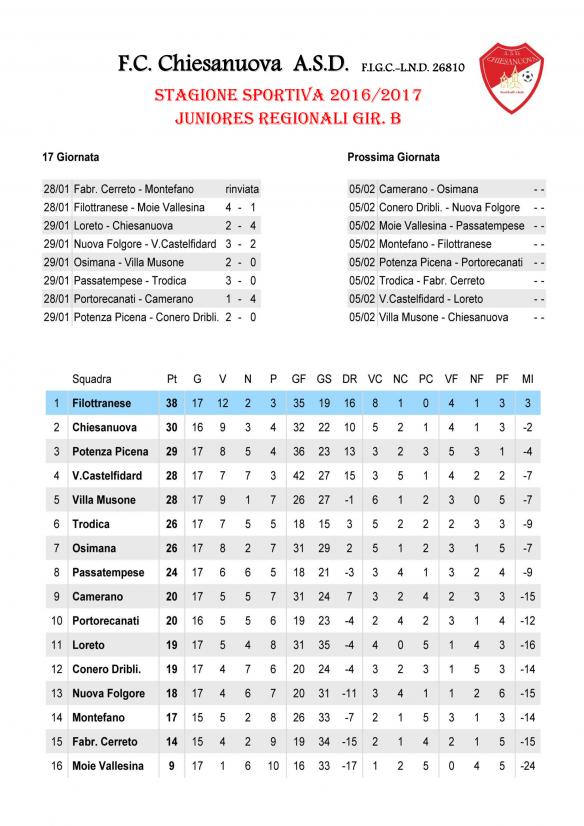 CU.226 JUNIORES Aggiornamento Risultati e Classifica ..