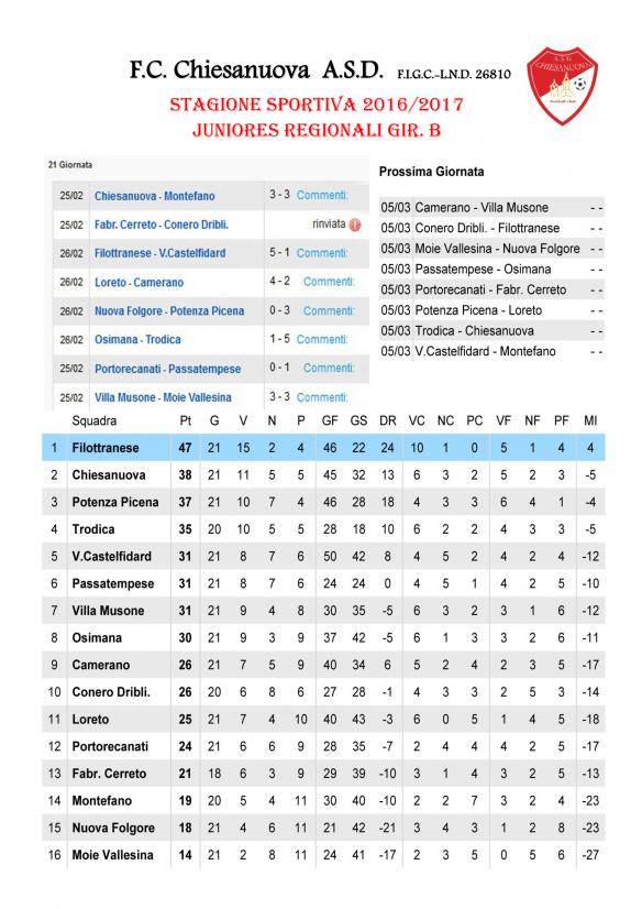 CU.226 JUNIORES Aggiornamento Risultati e Classifica ..