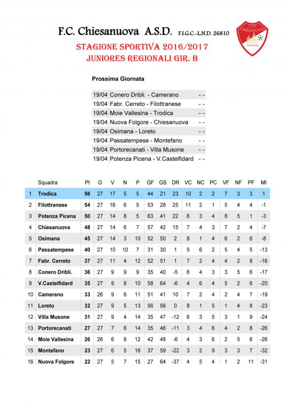 CU.226 JUNIORES Aggiornamento Risultati e Classifica ..